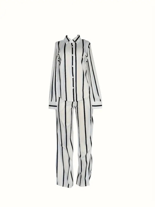 2025 New Stripe Printed Two Piece Set, Button Front Collar Long Sleeve Shirt&High Waist Wide Leg Loose Pants Set, Fashionable Women's Wear