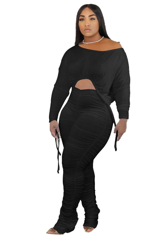 Autumn And Winter New Cross-border Fashion Midriff-baring Long Sleeve Top And Trousers Leisure Suit