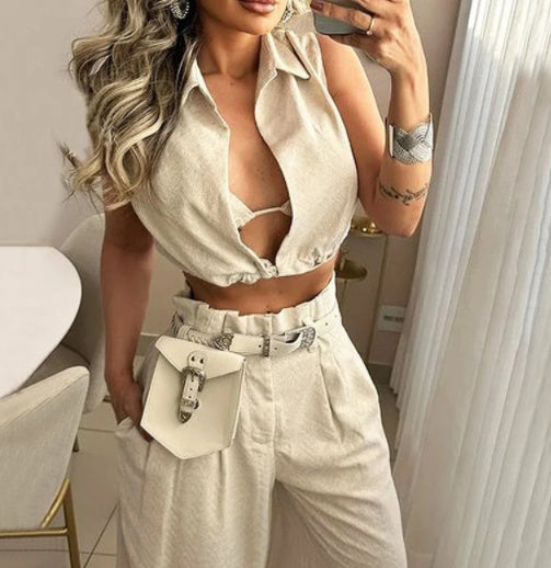 Solid Color Lapel Sexy Sleeveless Top Casual Pants Set