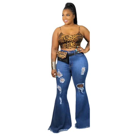 Sexy Mid-waist Retro Tattered Jeans Elastic Corns Bandage Mop Denim Bell-bottom Pants