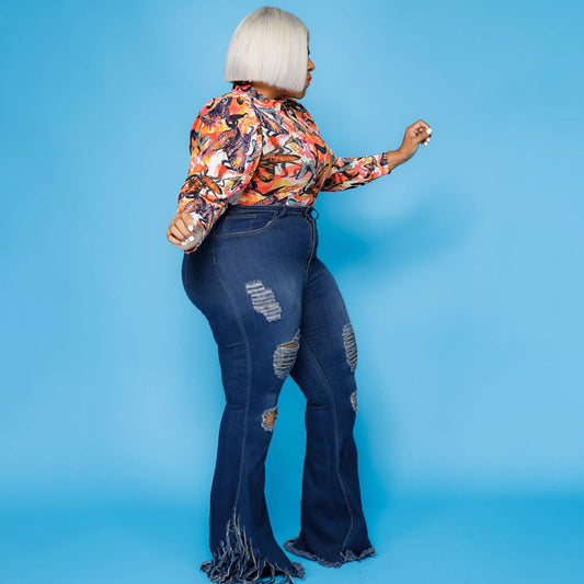 Women's Large Size Slim Fit Ripped Tassel Jeans